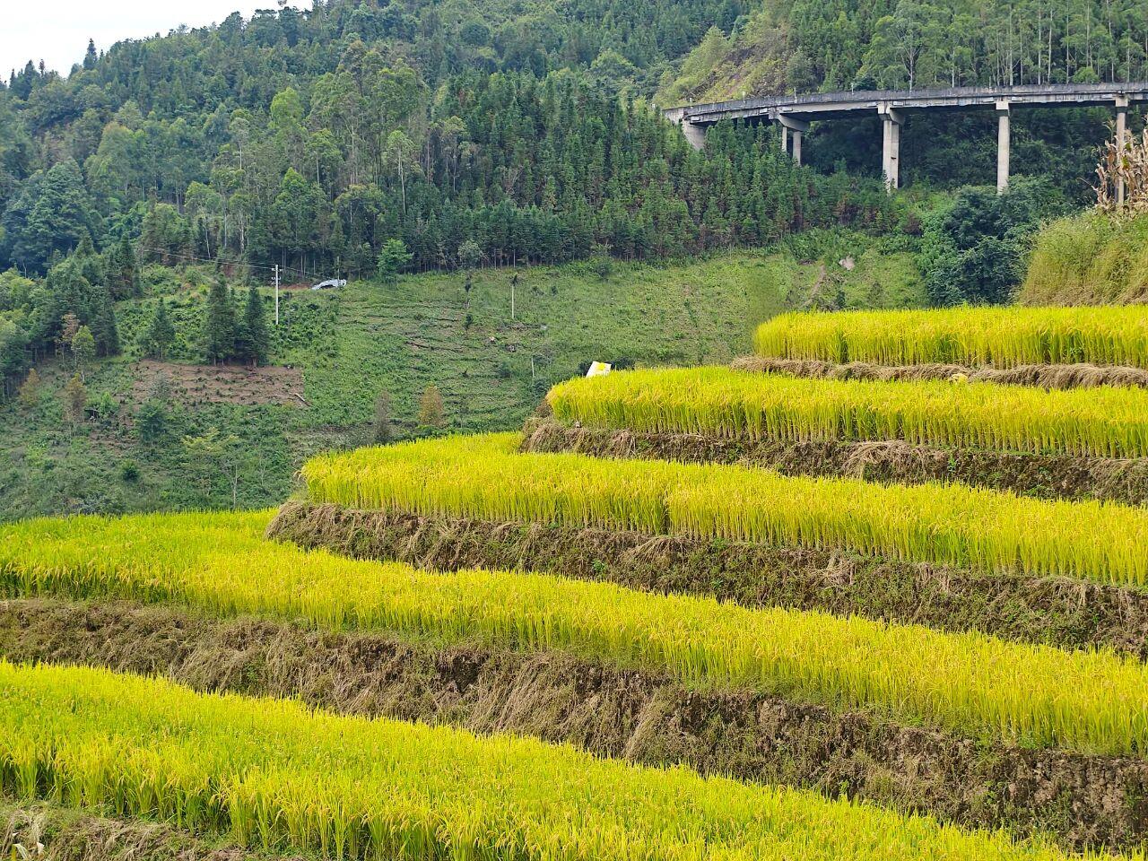 与此同时,俄普村委会的612亩再生稻在当地农技人员全程指导和自身精心管护下喜获丰收,金黄的稻浪与格波村的旱地优质稻相映成趣,绘就出戈奎乡秋日丰收的绝美画卷。