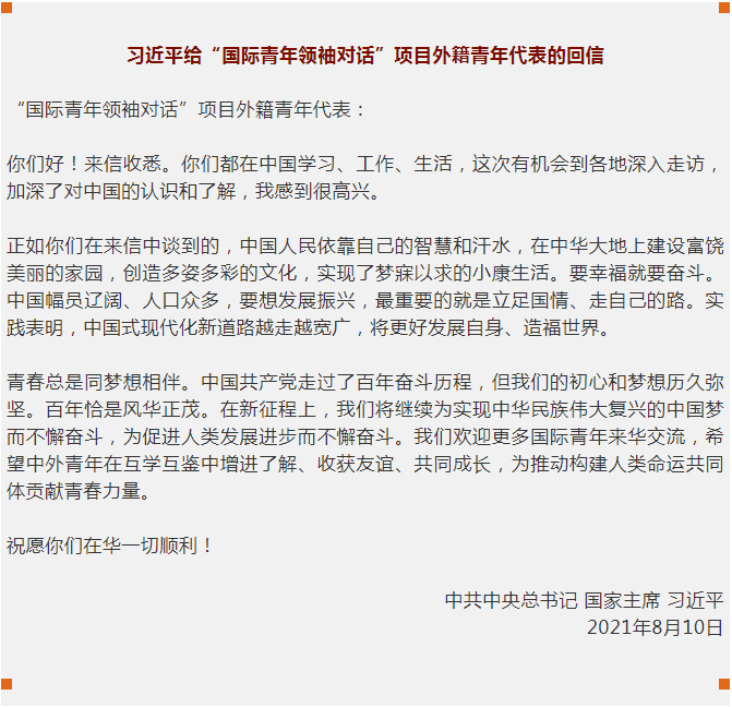 中共中央总书记、国家主席习近平8月10日给“国际青年领袖对话”项目外籍青年代表回信,对他们积极到中国各地走访、深化对华了解表示赞赏,鼓励他们加强交流互鉴,为推动构建人类命运共同体贡献青春力量。