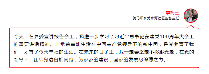 在骑马坝乡,县委宣讲团成员用通俗易懂的语言阐述了习近平总书记“七一”重要讲话的重大意义、主要内容和丰富内涵,深入解读中国共产党百年奋斗的光辉历程、伟大成就、宝贵经验和实践启示,解读伟大建党精神的深刻内涵和时代价值,解读在新征程上以史为鉴、开创未来的根本要求,同时围绕讲话中提出的一系列新思想新观点新要求进行了系统宣讲。