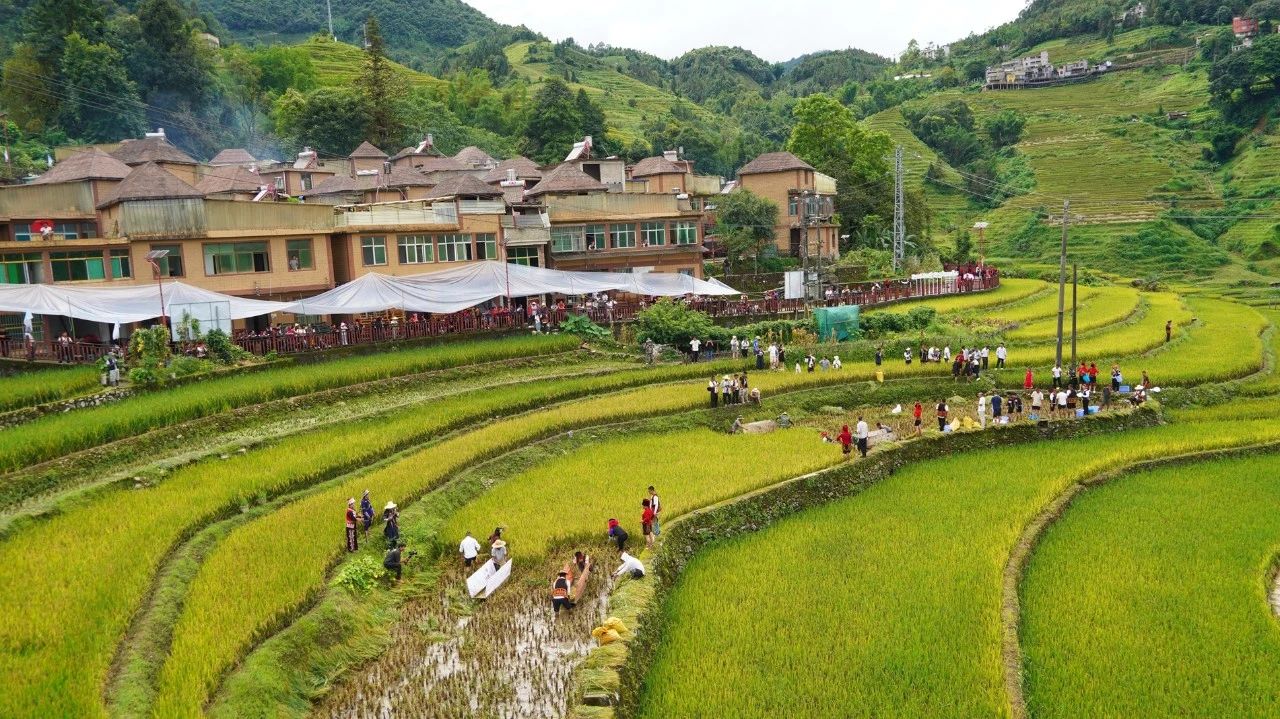 山谷里,稻农们穿梭在梯田里,正以传统农作方式抢收稻谷,割稻谷、打稻穗、装袋运送,大家挥汗如雨,辛苦劳作的同时,也享受着丰收的喜悦,田野里到处弥漫着稻谷的气息和丰收的景象。