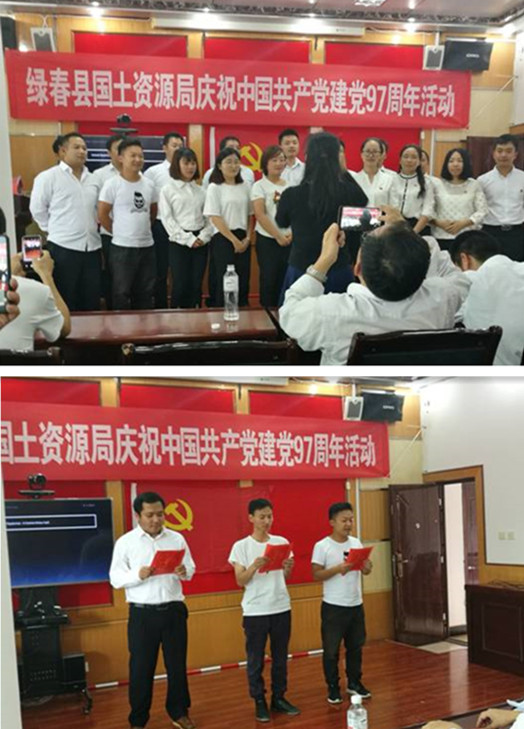 在中国共产党97周年华诞即将到来之际,为进一步激发广大党员的爱国热情,在“七一”建党节前夕,绿春县国土资源局于6月28日,开展了形式多样的“迎七一”庆祝活动,共祝寄语党的美好明天。