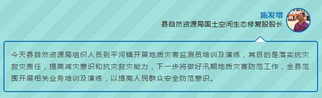 今天县自然资源局组织人员到平河镇开展地质灾害监测员培训及演练,其目的是落实抗灾救灾责任,提高减灾意识和抗灾救灾能力,下一步将做好汛期地质灾害防范工作,全县范围开展相关业务培训及演练,以提高人民群众安全防范意识。