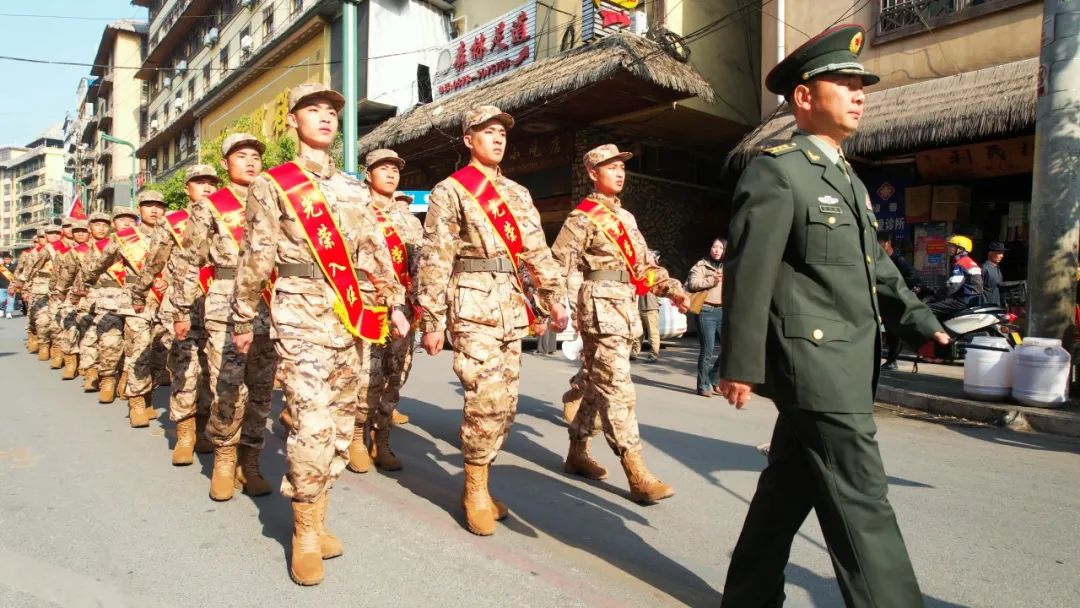 从戎礼现场,在牛角号队和锣鼓队的簇拥下,新兵们身着戎装,精神抖擞,迈着矫健的步伐,喊着嘹亮的口号从县人武部到欢送现场巡游,接受家乡人民的检阅,街道两边聚集了前来送行的亲朋好友,他们眼中满是不舍,同时也为孩子们的勇敢选择感到骄傲,大家纷纷拿出手机拍照留念……现场热闹非凡。