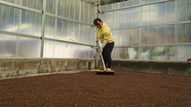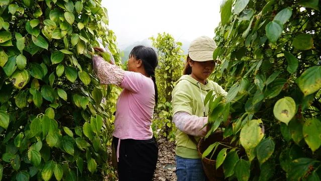 走进胡椒地,繁茂的胡椒藤蔓相互交织,层层叠叠的叶片下,一串串饱满的胡椒果簇拥在一起,农户们背着竹篓三五成群地穿梭其间,手中熟练地采摘成熟的胡椒,处处呈现出一副热火朝天的丰收盛景。采收结束后的胡椒被运至家中晒场脱粒、晾晒,阳光照射下,浓郁的椒香在空气中弥漫开来,农户们手持木耙,有节奏地翻动着胡椒,红绿交错的胡椒经历日光和时间的洗礼最终化作深沉的黑色,晒好的胡椒被农户们收集装袋后售往收购商处。