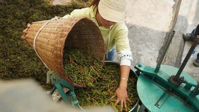 绿春县傣勐坪农产品加工厂负责人 白建逢:我收胡椒新鲜的也收,干的也收,新鲜的分成两部分,嫩的我做成泡胡椒,泡出来就供给绿春的各大超市和电子商务和做土特产的店面;老的鲜胡椒就做成白胡椒,还有晒干的黑胡椒就从老百姓手里收来,卖去广西、昆明等地。