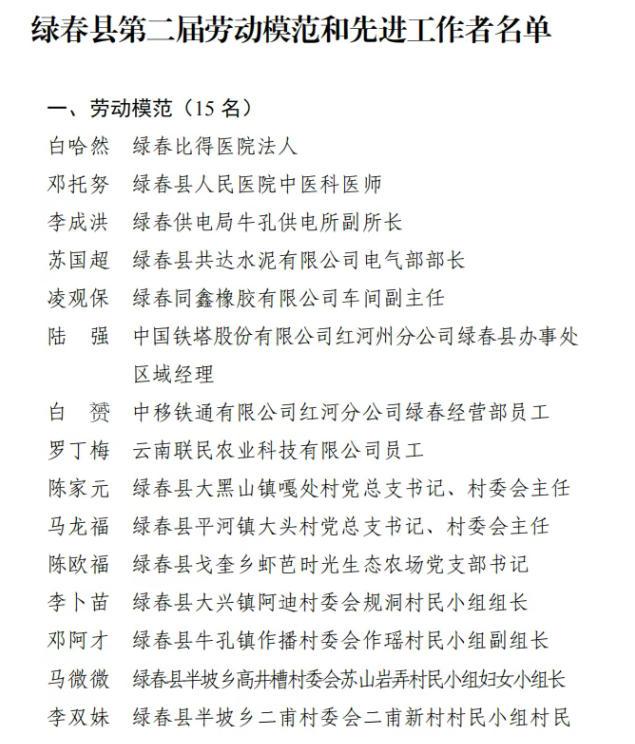 会上,县委副书记马俊宣读了表彰决定;白哈然等15人被授予“绿春县劳动模范”称号,李跃等15人被授予“绿春县先进工作者”称号,在全场热烈的掌声中,主席台就坐的县级领导为受表彰的先进代表们颁发荣誉证书;先进工作者代表现场宣读倡议书;受表彰的6名劳动模范和先进工作者代表分别作了先进事迹分享。