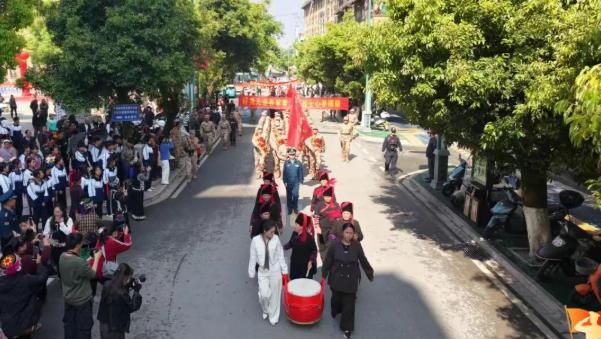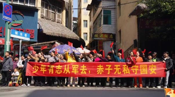 途中,各族群众自发聚集在街道两旁,手持五星红旗,拉起“参军光荣”“家乡骄傲”等横幅,为绿春好儿郎加油鼓劲。新兵家属跟着队伍一路前行,充分感受社会尊崇,脸上充满自豪,眼中满是期许。欢快的锣鼓声与乡亲们的祝福声汇成一片。