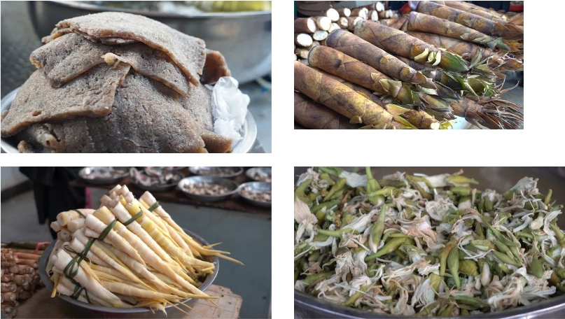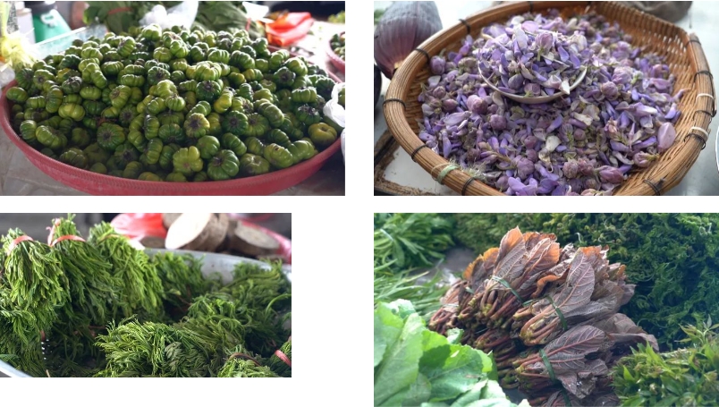 它们有的以捆卖菜,有的以碗卖花,有的以盘卖虫。早晨的阳光洒在山茅野菜上显得翠嫩欲滴,绿叶叶面所展现出的形状就表示着它们不同寻常的口味。每个摊位都有自己衡量价钱的器皿,摊位上各色各样的花骨朵被装在大小不一的碗中,奇形怪状的虫子装在大小不一的盘里进行售卖。当然还有常见的竹笋、黄泡这类季节性食物,是一种在春季深入骨髓的必吃习惯。这些因春而生的奇特动植物是勤劳的人们从山林里采来的、地里弄来的、田里抓来的,是大自然的产物,无需任何人工施肥和打药,让人们能安心享用美味。