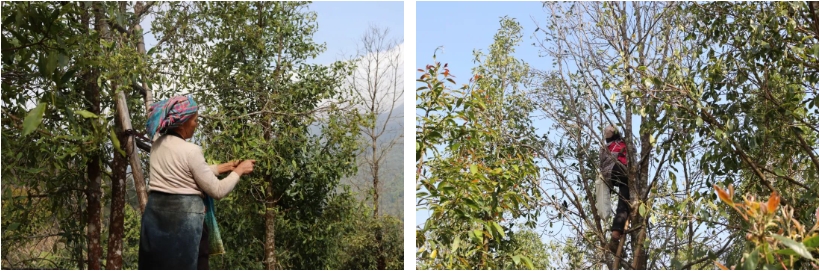一大早,随着第一缕太阳缓缓升起,下卡欧的村民们带上了自制的“瑶族背篓”,三五成群地赶往八角地采摘“春果”。