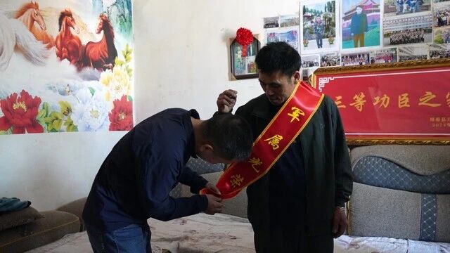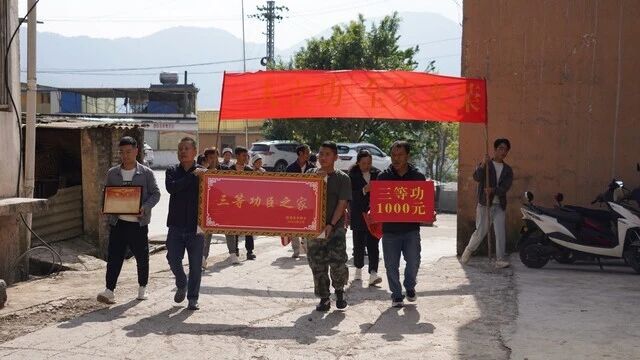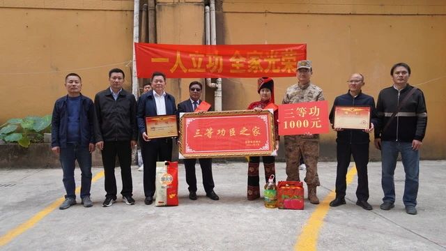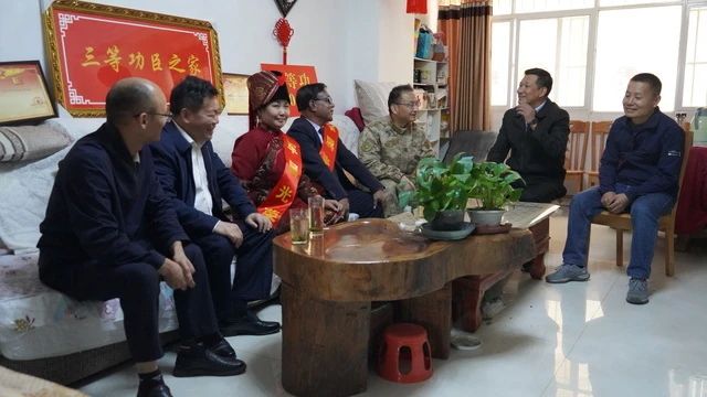 锣鼓喧天,喜气洋洋。慰问组一行为立功的家属佩戴立功绶带并合影留念,随后与其家属进行了亲切的交谈,详细了解了他们的家庭和身体情况,同时,感谢他们为国家和部队培养输送了优秀的战士,感谢他们长期以来的付出与支持,希望他们继续鼓励孩子在部队安心服役,为祖国的国防和军队建设做出更大的贡献。
