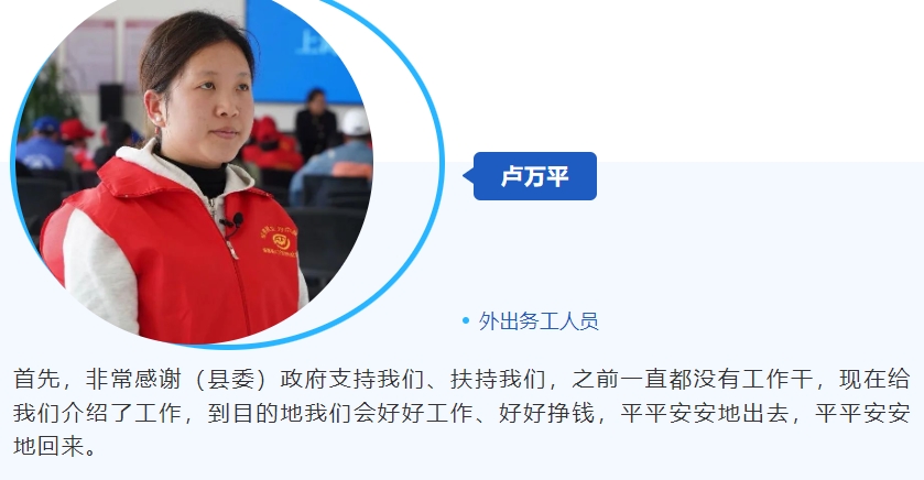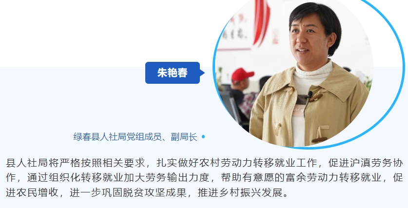 何阳希望我县各级各部门统筹推进劳务输出工作机制,让务工人员在外安心工作,广大外出务工人员艰苦创业、遵守厂规厂纪,努力工作,打造和树立“绿春劳动者”的良好形象,在外积极努力学技能、长本事,用自己勤劳的双手创造美好的明天,为家乡父老争光、创收入,并通过自身经历发挥积极的典型示范作用,带动更多的人投身到劳务输出的大潮中,为开辟全县劳务输出工作的新途径创造更宽更广的路子。