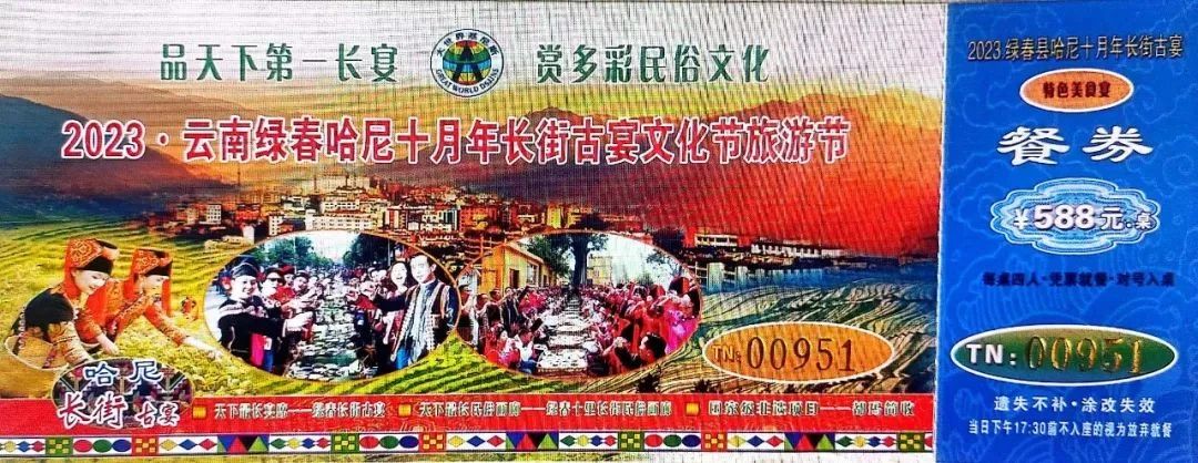 2023云南绿春哈尼十月年长街古宴文化旅游节长街古宴餐券于2023年9月6日起对外售卖以来,得到了广大游客的青睐和购买,餐券销售十分火爆。原计划4065桌的摆宴桌数即将销售完毕,销售截止时间为2023年11月18日下午 17:00,售完或停售后不再售卖。需要购买的可以通过线上和线下方式购买!