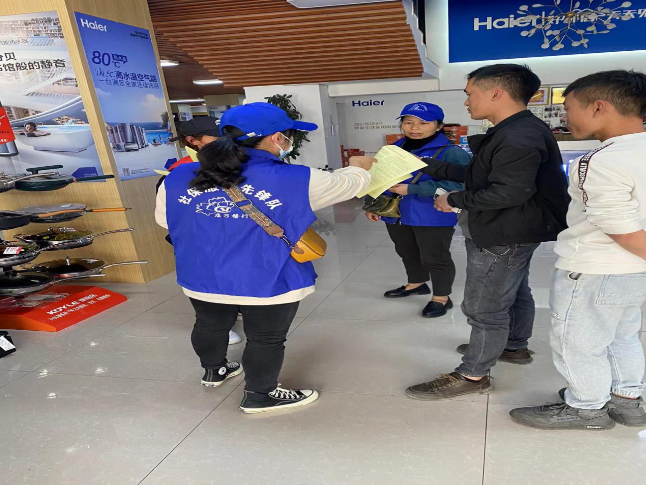三是线下服务“零距离”,社保服务“更暖心”。建立局领导干部挂钩联系乡镇“包保”工作机制,建立县乡村3级联动,全面覆盖全县4镇5乡,组建4支社保服务先锋队开展“三出三进三深入”服务,即“走出机关、走出窗口、走出柜台,走进社区、走进厂舍、走进家门,深入基层、深入一线、深入群众”,针对部分高龄、卧病在床等行动不便老年人和特殊群体主动上门提供社保待遇资格认证等服务,聚焦农民工、灵活就业人员、外卖“骑手”、视频主播等新业态从业人员、被征地农民等重点群体,广泛宣传城镇职工基本养老保险参保政策、社会保险转移接续、工伤认定、云南人社“12333”待遇资格认证操作流程、城乡居民养老保险参保以及待遇支付等人社法律法规政策,为群众提供了“看得明,听得懂,算得清,办得了”的服务。同时,进一步摸清快递小哥、个体工商户等8+N类灵活就业法定参保群众的参保情况,分类建立扩面参保实名库精准锁定扩面对象。2023年以来,社保服务先锋队深入一线开展社保政策宣传活动20次,服务群众1030人次,发放参保宣传资料1580份。