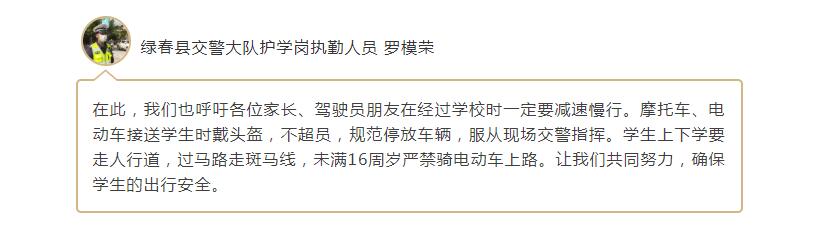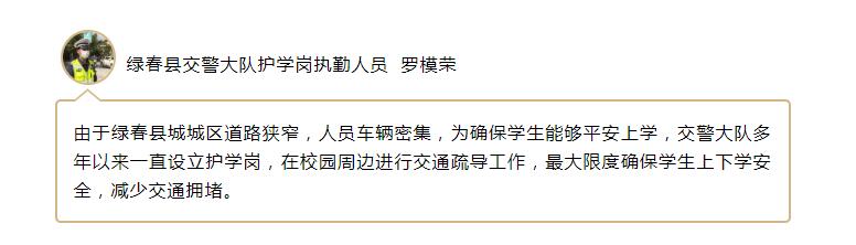 绿春县公安局交警大队“护学岗”执勤人员每日早、中、晚高峰都会提前到岗,疏导交通,引导接送学生车辆“即停即走”,指挥车辆有序通行、规范停车,确保校园周边路段交通秩序井然,最大限度地避免和减少交通拥堵以及交通事故的发生,保障学生平安上下学,努力为学生、接送孩子的家长开创“绿色通道”。