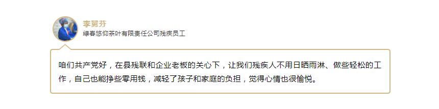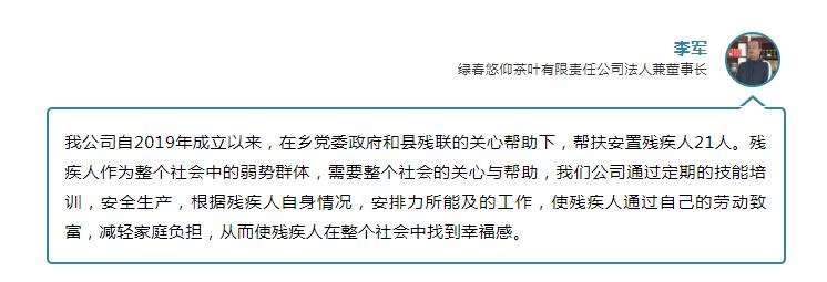 绿春悠仰茶业有限责任公司成立以来,一直关心残疾人就业难问题。2020年,秉承“互帮互助,共同富裕”的理念,面向周边村寨聘请工人,同时给予相对弱势的残疾人就业平台,对于残疾员工,该公司仅要求他们尽其所能,根据自身的伤残程度来完成工作,如:挑拣黄片、产品包装、厂房清洁等相关日常工作,薪酬亦根据不同的工作量每次支付50元-80元不等,当天结算。2021年6月,绿春悠仰茶业有限责任公司志愿申报省级残疾人就业示范基地,为我县的残疾人工作贡献绵薄之力。