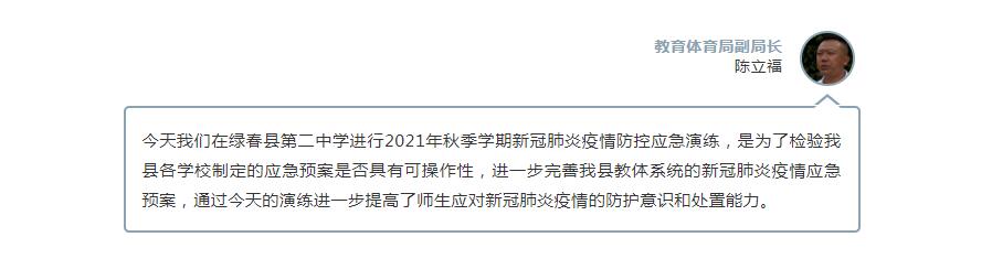 近日,绿春县第二中学为坚决打好新型冠状病毒疫情防控阻击战,落实落细学校疫情防控应急演练预案,全面提高学校应对疫情的应急反应能力,熟悉应急处置具体过程,为做到早发现、早报告、早隔离、早诊断、早治疗,促进学校防控和救治工作的科学化、标准化、程序化,绿春县第二中学在校园开展了一场新冠肺炎疫情防控应急实战演练,全体师生参与演练。