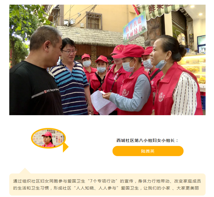 在活动现场,记者看到穿着红马甲、头戴“小红帽”的爱国卫生“7个专项行动”巾帼连心志愿队伍宣传员,正在参与由市监局、妇联组织开展的集中培训、集中宣传、志愿服务活动,她们分别来自西城社区、东城社区、大寨社区等6个社区。
