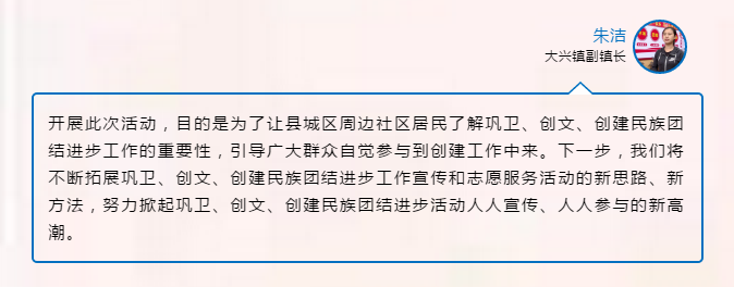6月9日,由县七个专项行动办、文明办、民族团结进步创建办主办,县妇联、总工会、团县委、大兴镇联合开展了“建党百年 志愿同行——巩卫、创文、创民族团结进步进村社”志愿服务活动,进一步营造“创建工作人人宣传、人人参与”的浓厚氛围,促进巩卫、创文、创民族团结进步工作不断发展。