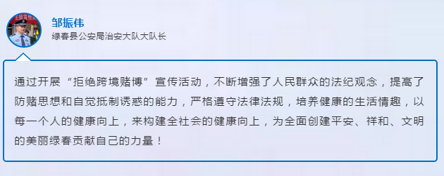 下一步,绿春县公安机关将以此次宣传周活动为契机,强化主动出击、防控堵截、行业监管、舆论宣传等工作措施,进一步汇聚力量、资源和手段,着力打好整体战、协同战、攻坚战,坚决整治跨境赌博。