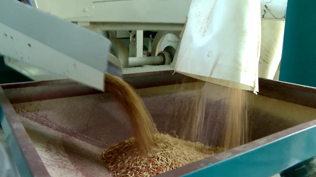 在红米加工厂,记者看到一袋袋谷粒丰满的稻谷整齐地堆放在仓库的角落,厂房里面的碾米机、提升机、砻谷机、去石机、大米分机筛等数台机器正有条不紊的作业,工人们正在给每一份包装袋贴上“标签”。