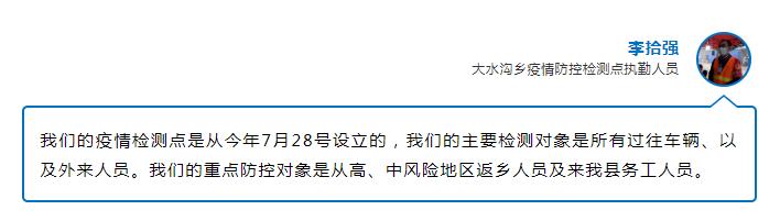 8月16日,记者来到大水沟乡疫情防控检查卡点,看到正在卡点执勤的民警冒着细雨对车辆进行逐一询查,让进出卡点的每个人到检查点逐一扫码、测温、登记。如果登记时发现乘客没戴口罩,会提醒对方佩戴后再进行交流,逐一记录他们从哪儿来、到哪儿去。