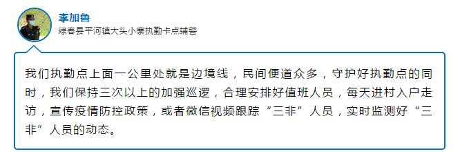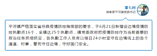 为加强边境疫情防控工作,绿春县平河镇多举措落实网格化管理、四级包保、十户联动、“三非”人员执行日报告制度,全面开展边境辖区排查、卡点通道巡逻与疫苗接种工作,坚决打赢疫情“外防输入、内防扩散”阻击战。
