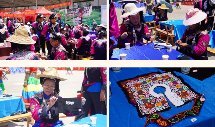 百名绣娘刺绣技艺大比拼活动火热开赛,绣娘们拿出自己的看家本领,专注地低头刺绣,手指熟练地穿梭于丝线之间,每一针都注入了她们的心血和情感,色彩缤纷的丝线在她们手中飞舞,转眼间就变成了一幅幅精美的作品。活动现场,来自不同地区的游客与非遗传承人和手工艺人们自由交流、互动,共同探讨民族文化的内涵和价值,这种跨文化的交流不仅加深了人们对彼此文化的理解和尊重,更促进了不同文化之间的融合与共生。