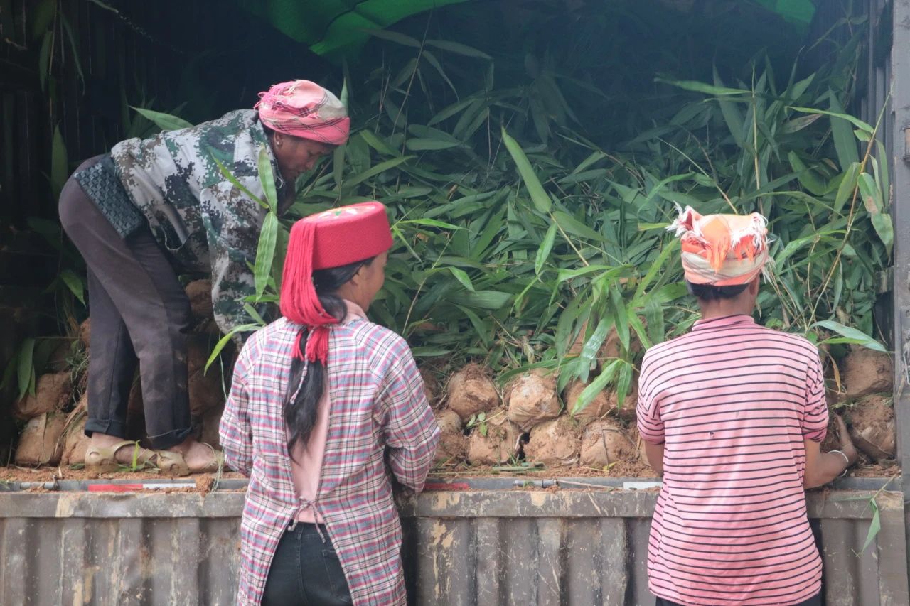 “快快快,水果笋到村口了,大家快去领。”在三猛乡爬别村委会哈波村,几位村民正在忙着从运苗卡车上卸货,他们兴高采烈动作利索,不一会儿的功夫,笋苗就卸装完成。