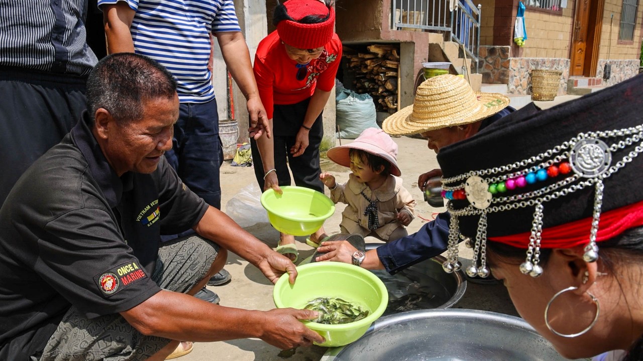 三猛乡灯马村村民 李黑规:今天我们把鱼苗放到梯田里面,两三个月后又可以卖了。一年下来,我们卖稻花鱼也有一笔很好的收入。