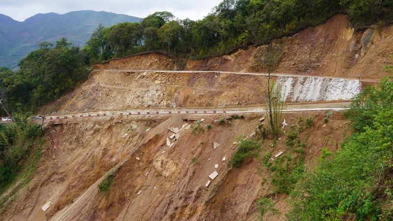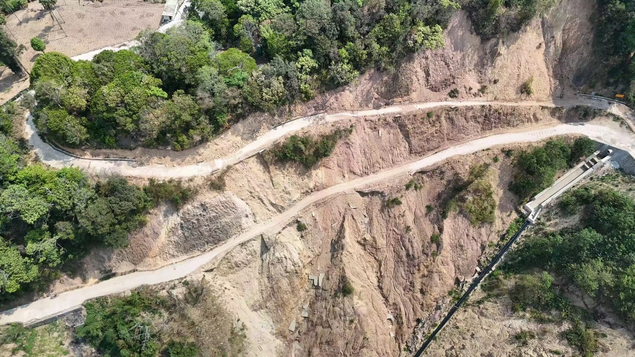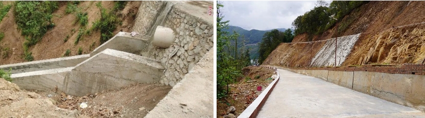 2022年,阿松村东南侧出现滑坡,滑坡后缘道路路面也发生塌陷,作为进村的必经之路,“行路难”问题成为困扰这个村群众的心头大事。戈奎乡立足工作实际,采用“双边护岸堤+固床肋坎+排水沟”“削方+挡墙+挡水条+防护栏”的治理方式,为山洪沟设置双边护岸堤+固床肋坎,在山洪沟外侧稳定区域设置排水沟,在破损道路下方开挖土石方,底部构建地梁,建立护坡挡土墙,铺设钢筋混凝土路面,边坡做挡水条,路边建设护栏,切实保障人民群众生命财产安全。