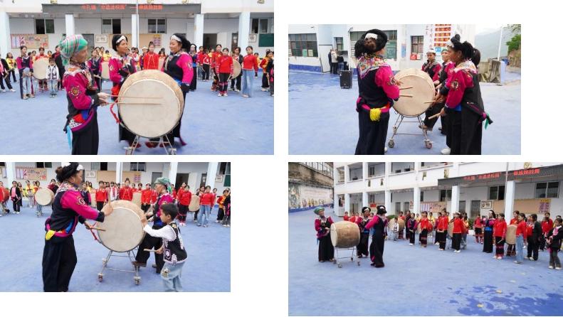 彝绣技艺培训结束后,开展了跳鼓舞培训。牛孔彝族《跳鼓舞》于2009年列入第二批省级非物质文化遗产名录。在培训现场,跳鼓舞传承人李用霞老师和她的舞伴们,从《跳鼓舞》开场鼓、制鼓、腌酸菜、春耕、撒秧、栽秧、薅秧等常用的16套鼓技边跳边作了详细的讲解。身着彝族服饰的孩子们,踩着紧凑激昂的鼓点,与授课老师热情激昂地跳起了彝族跳鼓舞。气势磅礴的鼓声与飞扬的流苏、欢快的舞步融为一体,构成一幅热情奔放的美妙画卷,让同学们仿佛置身于古老的彝族世界,感受了那份独特的文化魅力。