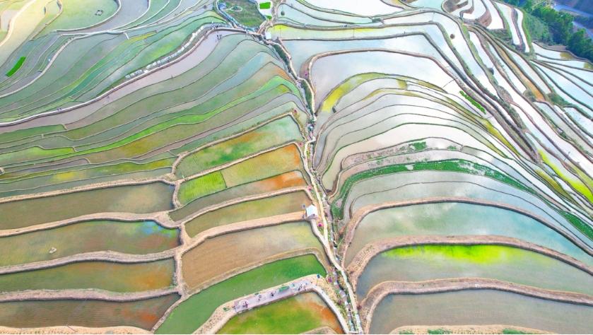 随后,“开秧门”民俗活动暨农耕文化情景展演也正式开始。哈尼族老者身着传统服饰,以古朴的祭词祈福风调雨顺、五谷丰登。随着祈福仪式结束,村民们拿着秧苗踏入水田,将一株株秧苗插下,这是农民播种希望的种子。一场以梯田为舞台、农民为演员、农具为道具的情景式文化盛宴,将通过田间劳作和民族舞蹈表演相结合的方式,向广大游客呈现博大精深的梯田农耕文化和多姿多彩的三猛腊咪文化,展现哈尼人民不怕苦、不怕累的大山精神和人与自然和谐发展的美丽画卷!不少游客表示,这场文化盛宴让他们理解了梯田不仅是风景,更是活态的农耕文化。