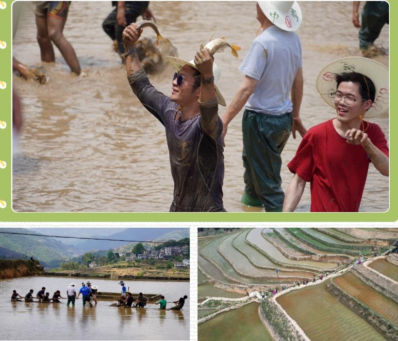 午后,梯田农耕体验赛点燃现场热潮。游客与村民组队跃入齐膝深的泥水稻田,在“围捕稻花鱼”中弯腰合围、浑水摸鱼。少年高举挣扎的鱼获欢呼,满脸泥浆却笑意飞扬。随即展开的泥田拔河赛里,参赛者深陷泥浆奋力后仰,田埂上的观众挥帽助威。同时,徒步爱好者穿行于层叠梯田,在行走间感悟哈尼先民“雕刻大地”的生态智慧。