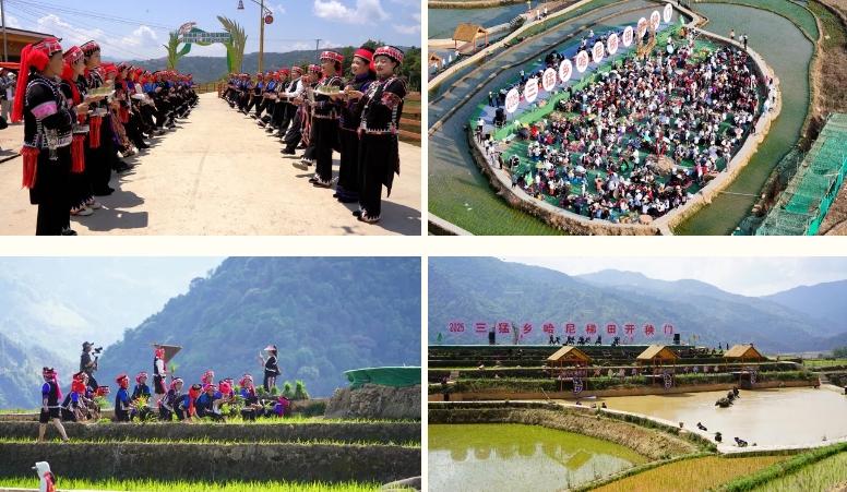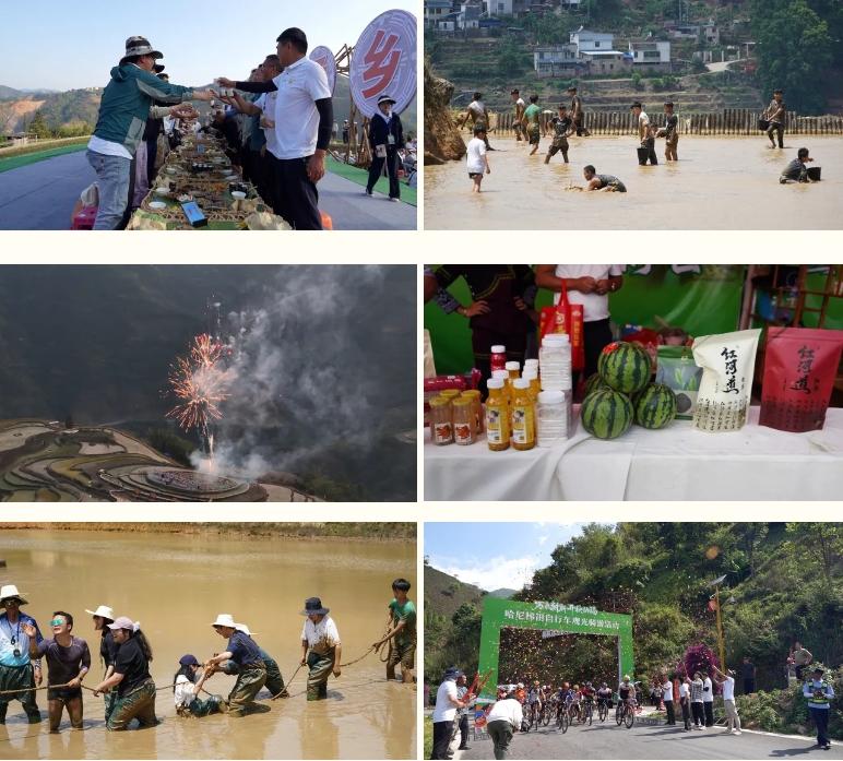 活动现场还设置了丰富的活动内容。游客们可参与哈尼梯田“开秧门”农耕文化体验比赛系列活动、自行车观光骑游等活动,也可体验哈尼梯田美食,逛乡村振兴名特优产品展销街,亦可观看哈尼梯田“开秧门”民俗活动及农耕文化情景展演和民族团结大联欢烟花秀等。