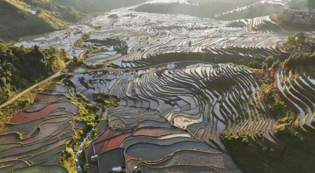 当朝暾跃上云崖,腊姑梯田在光影交响中绽露真容——它是哺育世代的膏腴之地,更是令世人屏息的诗意栖居。
