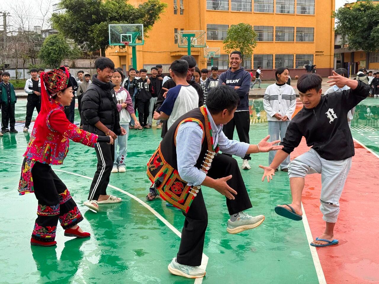 “‘同’代表着哈尼人的牛皮鼓,‘尼尼’则表示身体随鼓声的扭动与颤动,这声音、这姿态,皆是老祖宗流传下来的珍贵念想。教学环节在欢快的铓鼓声中启幕,传承人将舞蹈拆解为“转肩、扭腰、颤膝”三个基础模块,手把手纠正学生的姿态。学生们围拢过来学习,逐个动作耐心学习、虚心请教,从最初的动作僵硬逐步到逐渐掌握韵律,模仿“鸟型”时踮脚轻跃,演绎“猴型”时屈膝弓身,神态栩栩如生。操场上,铓鼓锣声交织成古朴的旋律,蓝白相间的校服与绣着图腾的民族服饰相互映衬,传统与现代完成了一场温暖的对话。
