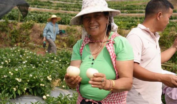 忙碌的田间,农户们脸上满是丰收的笑容。农户李规背手捧着刚采摘好的果肉饱满的人参果,脸上笑意盈盈:“以前从来没种过人参果,这次在家门口的基地务工,不仅每天都有稳定收入,老板还耐心教我们怎么摘果、什么样的果子品质最好。看着满田的果子,心里特别踏实,靠着自己双手干活赚钱,日子越过越有奔头。”