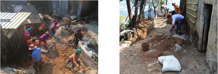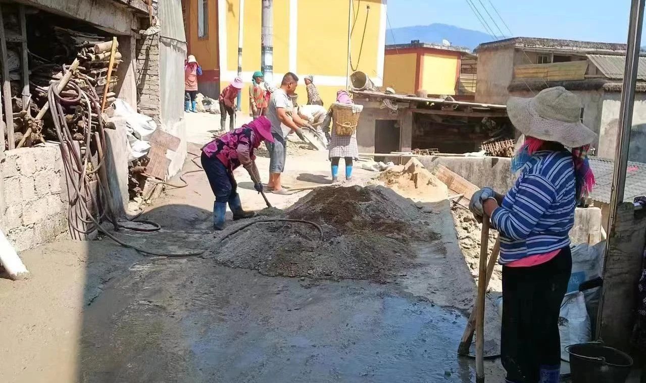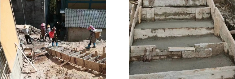 施工现场,有的村民为拓宽步道清理障碍物,有的负责运送物料,有的负责用铁锹平整路面,有的负责支模打板……大家分工明确,干劲十足。