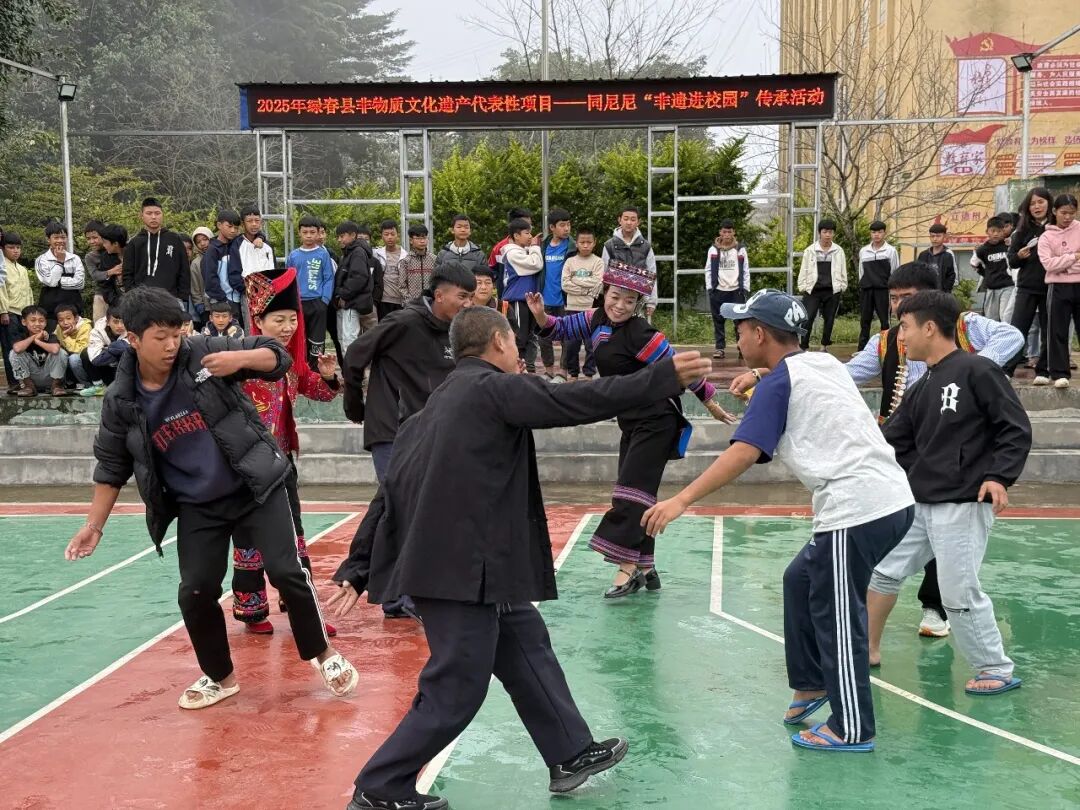 立足乡土、深耕文化,充分挖掘本地民族文化资源,将省级非物质文化遗产“同尼尼”舞蹈引入校园,精心打造“非遗+教育”特色课程,让非遗文化成为连接各民族学子的精神纽带。每年邀请省、州级非物质文化遗产代表性传承人走进校园,开展非遗进校园系列活动,传承人手把手教学生练习“转肩、扭腰、颤膝”等核心动作,耐心讲解舞蹈背后的文化内涵。铿锵的铙鼓声响彻校园,学子们模仿鸟兽姿态、演绎农耕场景,在一招一式中感悟哈尼先民对自然的敬畏、对丰收的期盼,在欢声笑语中传承民族文化。不同民族的学生在共同学习、共同演绎“同尼尼”舞蹈的过程中,打破隔阂、增进理解、凝聚认同,民族团结的种子在轻盈舞步间悄然生根、茁壮成长。截至目前,学校已成功开展非遗进校园活动3次,参与学生达300人次,让非遗文化在校园焕发新的生机与活力。