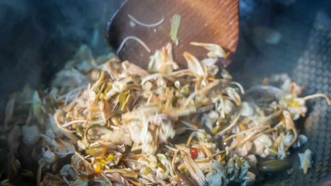在绿春,当玉荷花遇上农家酸菜,一场味蕾上的盛宴便拉开了帷幕。这道素炒玉荷花,在配料上巧妙地结合了农家腌制的酸菜,加以适量的盐和味精调味,再加几片新鲜肉片提鲜。每一种材料都是经过精心挑选,最大程度上保留玉荷花原本的清香与淡雅。