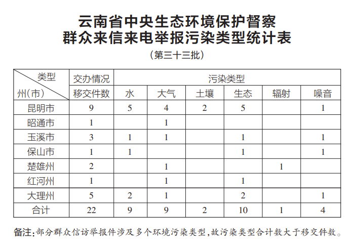 6月17日,中央第七生态环境保护督察组向云南移交第三十三批群众信访举报件22件,其中来电举报0件,来信举报22件。从信访举报件生态环境问题污染类型来看,涉及水9件、大气9件、土壤2件、生态10件、辐射1件、噪音4件。从区域分布上看,昆明市9件、昭通市1件、玉溪市3件、保山市1件、楚雄州2件、红河州1件、大理州5件。截至当日,云南省已累计收到中央第七生态环境保护督察组交办的信访举报件3143件,所有举报件均已及时转交相关州(市)处理。