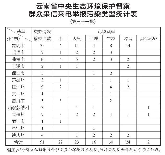6月9日,中央第七生态环境保护督察组向云南移交第三十一批群众信访举报件91件,其中来电举报37件,来信举报54件。从信访举报件生态环境问题污染类型来看,涉及水22件、大气23件、土壤16件、生态30件、噪音24件、其他污染2件。从区域分布上看,昆明市35件、昭通市7件、曲靖市10件、玉溪市2件、保山市3件、楚雄州3件、红河州9件、文山州1件、普洱市3件、西双版纳州3件、大理州9件、丽江市1件、怒江州1件、迪庆州4件。截至当日,云南省已累计收到中央第七生态环境保护督察组交办的信访举报件3032件,所有举报件均已及时转交相关州(市)处理。