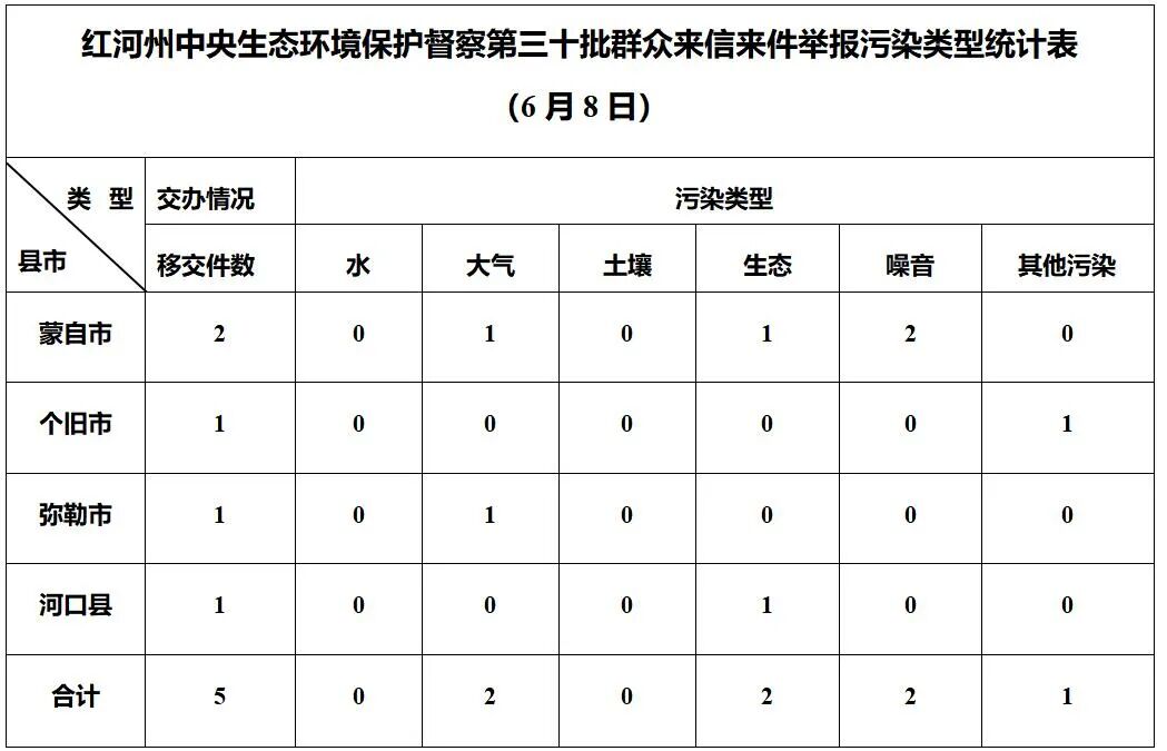 6月8日,红河州收到中央第七生态环境保护督察组交办的第三十批群众信访举报件5件(来信举报2件,来电举报3件),涉及蒙自市2件、个旧市1件、弥勒市1件、河口县1件;从信访举报件生态环境问题类型来看,涉及大气2件、生态2件、噪音2件、其他污染1件(部分举报件涉及多个问题类型)。