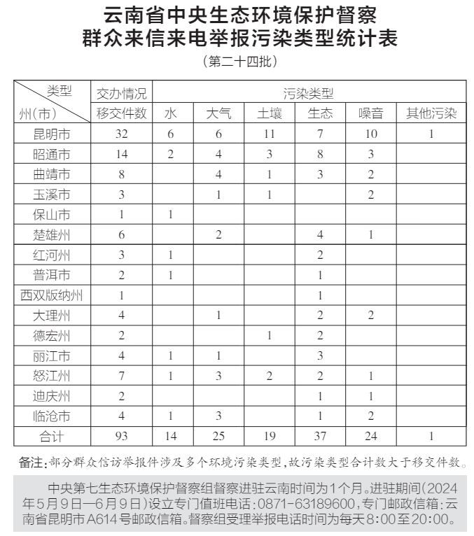 6月2日,中央第七生态环境保护督察组向云南移交第二十四批群众信访举报件93件,其中来电举报43件,来信举报50件。从信访举报件生态环境问题污染类型来看,涉及水14件、大气25件、土壤19件、生态37件、噪音24件、其他污染1件。从区域分布上看,昆明市32件、昭通市14件、曲靖市8件、玉溪市3件、保山市1件、楚雄州6件、红河州3件、普洱市2件、西双版纳州1件、大理州4件、德宏州2件、丽江市4件、怒江州7件、迪庆州2件、临沧市4件。截至当日,云南省已累计收到中央第七生态环境保护督察组交办的信访举报件2290件,所有举报件均已及时转交相关州(市)处理。