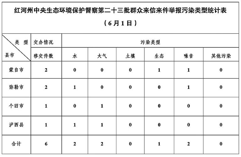6月1日,红河州收到中央第七生态环境保护督察组交办的第二十三批群众信访举报件6件(来电举报4件、来信举报2件),涉及蒙自市2件、弥勒市2件、个旧市1件、泸西县1件;从信访举报件生态环境问题类型来看,涉及水2件、大气2件、生态1件、噪音2件(部分举报件涉及多个问题类型)。