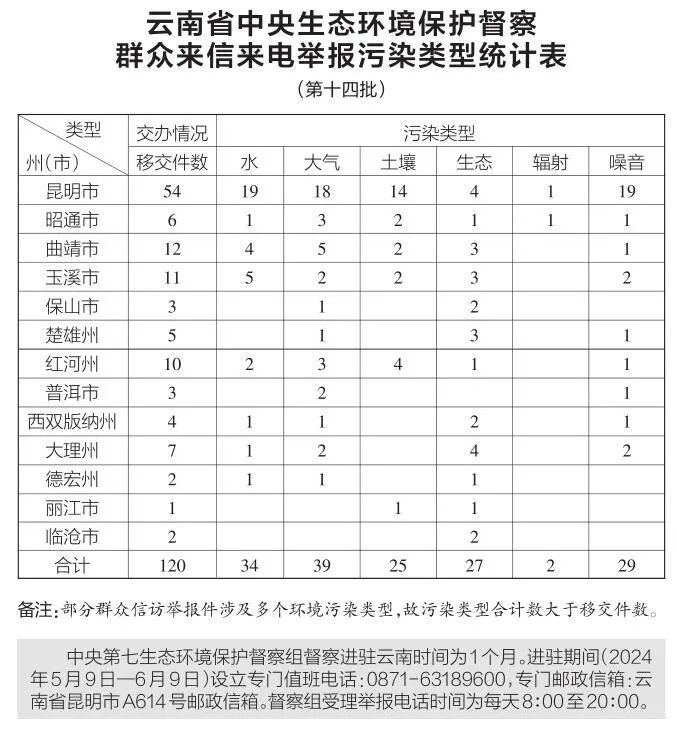 5月23日,中央第七生态环境保护督察组向云南移交第十四批群众信访举报件120件,其中来电举报66件,来信举报54件。从信访举报件生态环境问题污染类型来看,涉及水34件、大气39件、土壤25件、生态27件、辐射2件、噪音29件。从区域分布上看,昆明市54件、昭通市6件、曲靖市12件、玉溪市11件、保山市3件、楚雄州5件、红河州10件、普洱市3件、西双版纳州4件、大理州7件、德宏州2件、丽江市1件、临沧市2件。截至当日,云南省已累计收到中央第七生态环境保护督察组交办的信访举报件1179件,所有举报件均已及时转交相关州(市)处理。