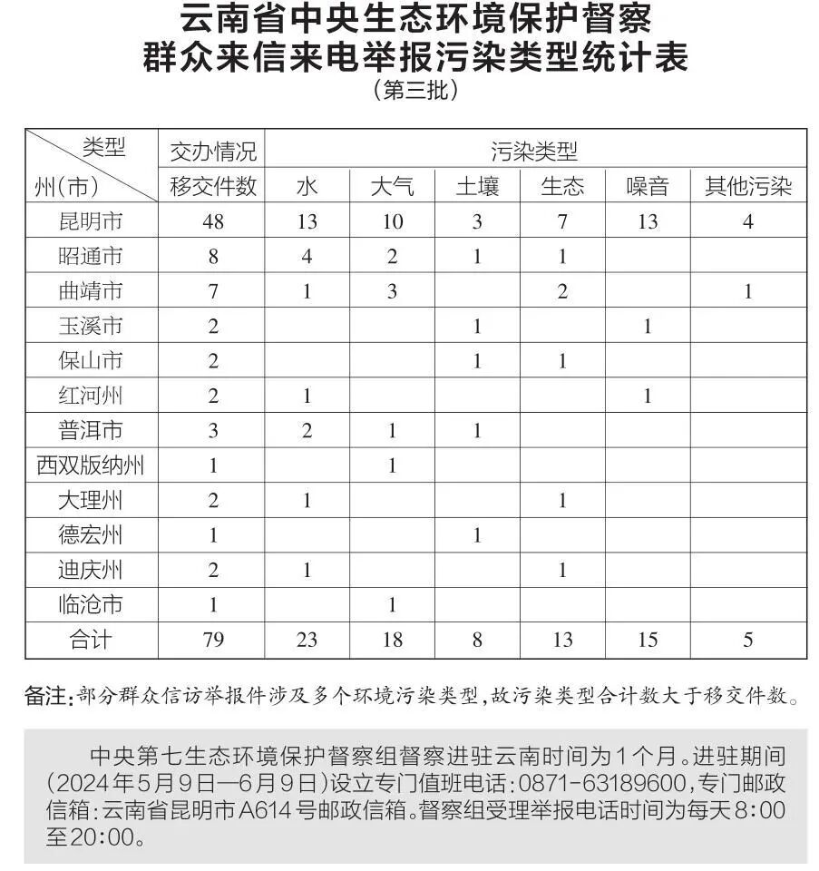 5月12日,中央第七生态环境保护督察组向云南移交第三批群众信访举报件79件,其中来电举报60件,来信举报19件。从信访举报件生态环境问题污染类型来看,涉及水23件、大气18件、土壤8件、生态13件、噪音15件,其他污染5件。从区域分布上看,昆明市48件、昭通市8件、曲靖市7件、玉溪市2件、保山市2件、红河州2件、普洱市3件、西双版纳州1件、大理州2件、德宏州1件、迪庆州2件、临沧市1件。截至当日,云南省已累计收到中央第七生态环境保护督察组交办的信访举报件169件,所有举报件均已及时转交相关州(市)处理。