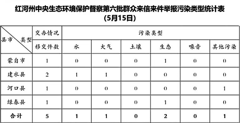 5月15日,红河州收到中央第七生态环境保护督察组交办的第六批群众信访举报件5件(其中来电举报0件,来信举报5件),涉及建水县2件、蒙自市1件、河口县1件、绿春县1件;从信访举报件生态环境问题类型来看,涉及生态2件、大气1件、水1件、其他污染1件。