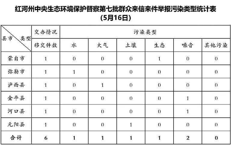 5月16日,红河州收到中央第七生态环境保护督察组交办的第七批群众信访举报件6件(其中来电举报4件,来信举报2件),涉及蒙自市1件、弥勒市1件、泸西县1件、金平县1件、河口县1件、元阳县1件;从信访举报件生态环境问题类型来看,涉及噪音2件、生态1件、大气1件、水1件、土壤1件。