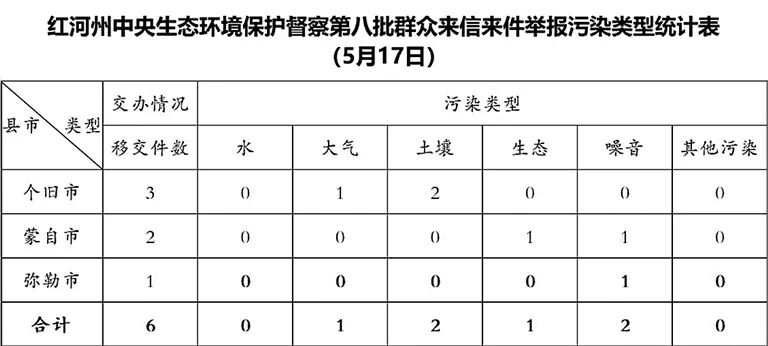 5月17日,红河州收到中央第七生态环境保护督察组交办的第八批群众信访举报件6件(其中来电举报4件,来信举报2件),涉及个旧市3件、蒙自市2件、弥勒市1件;从信访举报件生态环境问题类型来看,涉及土壤2件、噪音2件、生态1件、大气1件。
